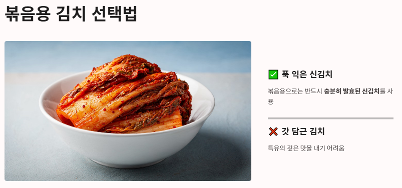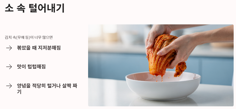 맛있는 볶음의 기초는 재료의 상태를 파악하는 것입니다. 김치볶음 맛있게 하는법에서 가장 먼저 챙겨야 할 것은 김치의 과한 신맛을 잡고 감칠맛의 토대를 만드는 전처리 과정입니다.