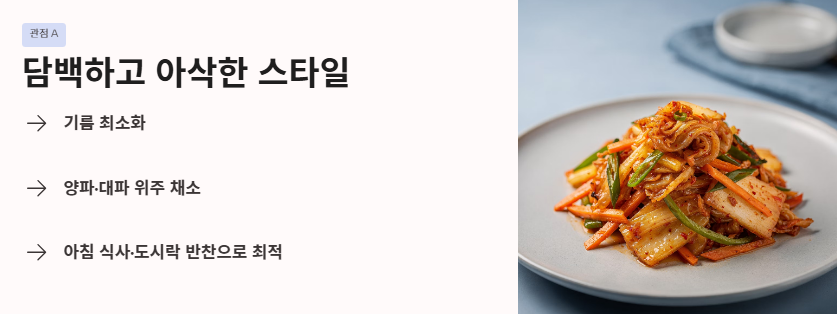 - 관점 A: '담백하고 아삭한' 김치 중심 스타일 기름 사용을 최소화하고 김치 본연의 맛을 살립니다. 양파나 대파 위주의 채소를 곁들여 뒷맛이 깔끔하고 시원한 김치볶음 맛있게 하는법을 선호하는 분들에게 적합합니다. 아침 식사나 가벼운 도시락 반찬으로 좋습니다.