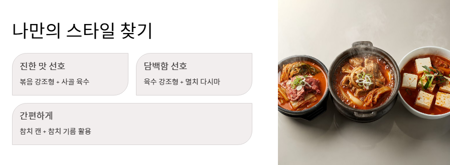 - 참치 김치찌개 변형: 돼지고기 대신 참치 캔을 넣을 때는 참치 기름을 먼저 팬에 두르고 김치를 볶는 것이 감칠맛을 극대화하는 김치찌개 맛있게 만드는 방법입니다.
