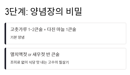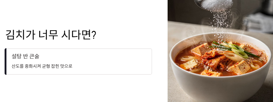 - 신맛이 강할 때는 설탕을, 감칠맛이 부족할 때는 새우젓을 활용합니다.