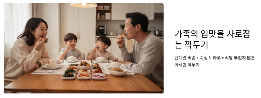 결론적으로 깍두기 맛있게 담는법은 '기다림과 비율'의 조화입니다. 서두르지 않고 무를 절이고, 양념이 배어들 시간을 충분히 주는 정성이 들어갔을 때 최고의 맛이 탄생합니다. 오늘 알려드린 단계별 비법과 숙성 노하우를 활용하신다면, 식당 부럽지 않은 아삭한 깍두기로 가족들의 입맛을 사로잡을 수 있을 것입니다. 작은 차이가 여러분의 식탁을 명품으로 바꿔줄 것입니다. 깍두기 맛있게 담는법으로 오늘 바로 맛있는 도전을 시작해 보세요!