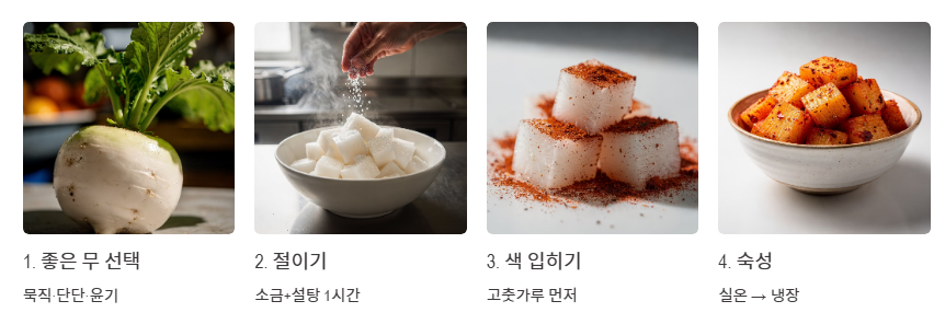 - 무의 쓴맛 제거: 만약 무가 매운맛이나 쓴맛이 강하다면, 절일 때 설탕을 약간 추가하면 맛이 훨씬 부드러워지는 깍두기 맛있게 담는법의 비결이 됩니다.