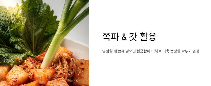- 쪽파와 갓 활용: 양념할 때 쪽파나 갓을 함께 넣으면 향긋함이 더해져 더욱 풍성한 깍두기 맛있게 담는법을 경험할 수 있습니다.
