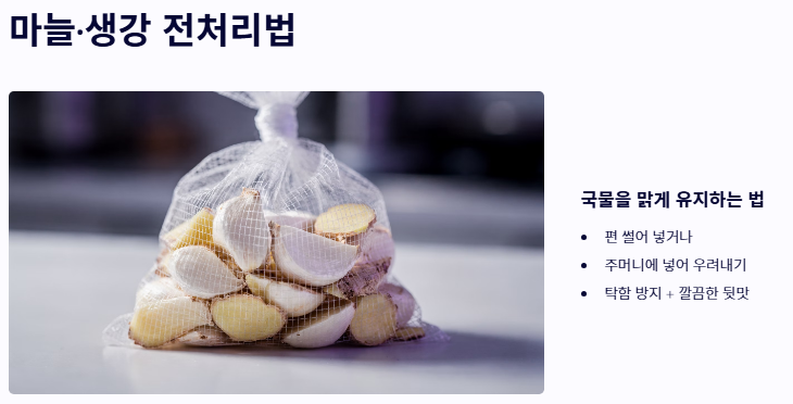 - 마늘과 생강의 전처리: 마늘과 생강은 편 썰어서 넣거나 주머니에 넣어 우려내세요. 국물이 탁해지는 것을 막고 깔끔한 뒷맛을 보장하는 나박김치 맛있게 담그는법의 필수 기술입니다.