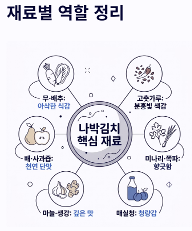 - 물기 제거: 절여진 채소에서 나온 물은 버리지 않고 국물에 활용하거나, 아예 깨끗한 소금물로 헹구어 물기를 빼두는 것이 깔끔한 나박김치 맛있게 담그는법의 팁입니다.