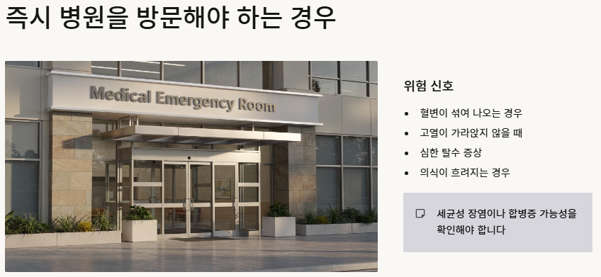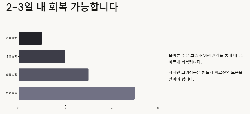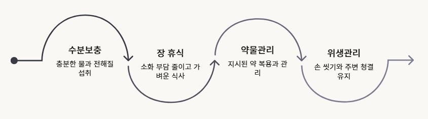 - 대처법: 전해질 보충, 장 휴식, 지사제 남용 금지, 염소 소독.