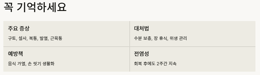 - 주요 증상: 구토, 설사, 복통, 발열, 근육통이 복합적으로 나타나는 노로 바이러스 장염 증상.