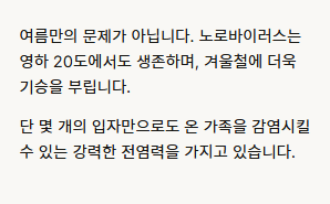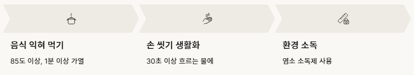- 예방책: 음식 익혀 먹기, 손 씻기 생활화로 노로 바이러스 장염 증상 원천 차단.