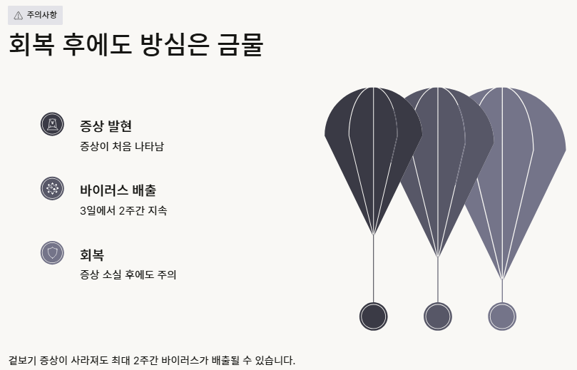- 전염성: 증상 소멸 후에도 전염력이 유지되므로 주의가 필요함.