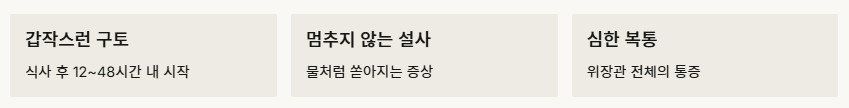 노로 바이러스 장염 증상은 보통 바이러스에 오염된 음식이나 물을 섭취한 후 12~48시간의 잠복기를 거쳐 폭발적으로 나타납니다.