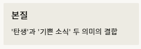 - 본질: '탄생'과 '기쁜 소식'이라는 두 가지 핵심 노엘의 뜻이 결합해 있습니다.