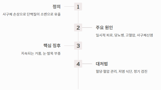 - 정의: 신장 필터(사구체) 손상으로 인해 소변으로 단백질이 새어 나가는 현상.