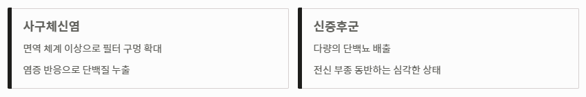 - 신증후군: 다량의 단백뇨가 쏟아져 나오며 전신 부종이 동반되는 심각한 상태입니다.