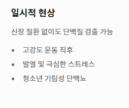 모든 단백뇨가 질병을 의미하지는 않습니다. 다음과 같은 상황에서는 신장에 병이 없어도 일시적으로 단백질이 검출될 수 있습니다.