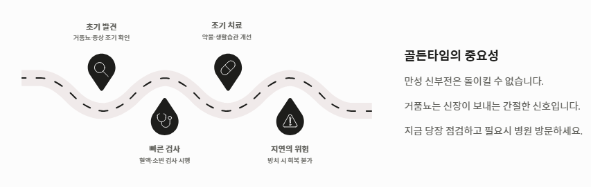 - 핵심 징후: 사라지지 않는 조밀한 거품, 눈 주위나 발목의 부종.