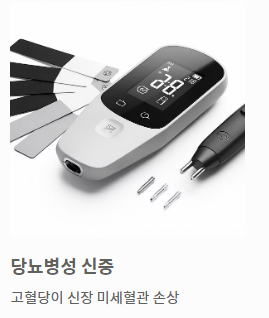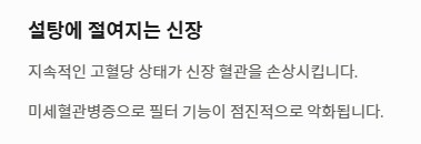 - 당뇨병성 신증: 고혈당 상태가 지속되면 신장의 미세 혈관이 설탕에 절여지듯 손상됩니다.