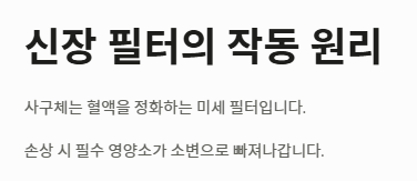 - 사구체신염: 면역 체계의 이상으로 사구체에 염증이 생겨 필터 구멍이 커지는 질환입니다.