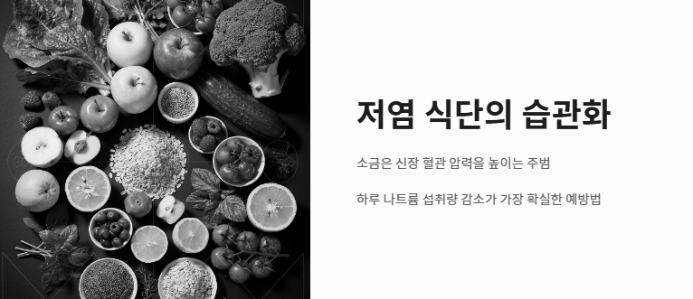 - 저염 식단의 습관화: 소금은 신장 혈관 압력을 높이는 주범입니다. 하루 나트륨 섭취량을 줄이는 것이 가장 확실한 예방법입니다.