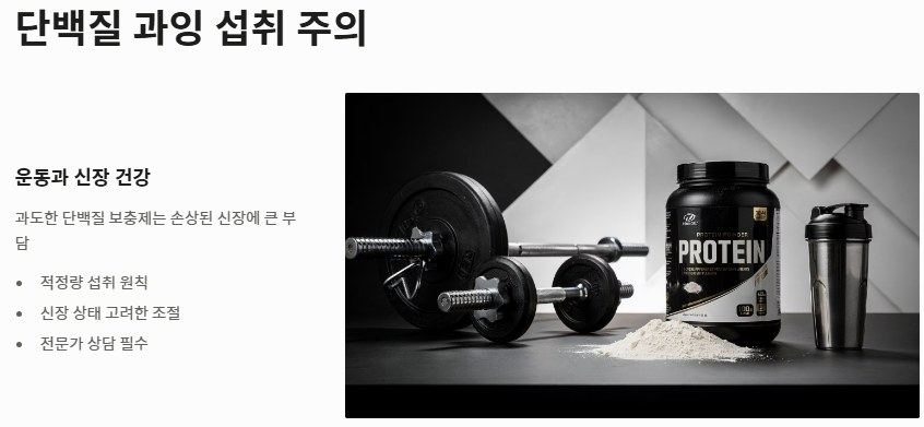 - 단백질 과잉 섭취 주의: 운동을 위해 과도하게 섭취하는 단백질 보충제는 이미 손상된 신장에 큰 부담을 줄 수 있습니다.