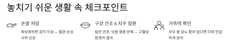 - 구강 건조와 치주 질환: 입안이 자주 마르고 잇몸 염증이 잘 낫지 않는 것도 고혈당 환경에서 세균이 번식하기 쉽기 때문입니다.