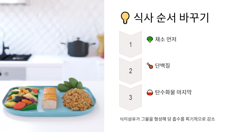 - 식사 순서 바꾸기: 채소 → 단백질 → 탄수화물 순으로 먹으면 식이섬유가 그물을 형성해 당 흡수를 획기적으로 줄여줍니다. 당화혈색소 정상치를 만드는 아주 쉬운 방법입니다.