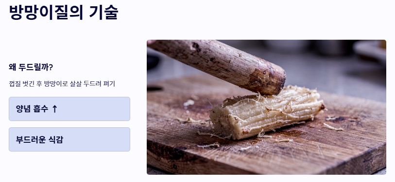 - 방망이질의 기술: 껍질을 벗긴 후 방망이로 살살 두드려 펴주면 양념이 더 잘 배어들고 부드러운 식감을 낼 수 있습니다.