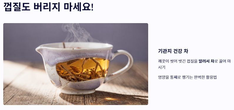 - 소금물에 담가 아린 맛을 제거하고 남은 껍질은 차로 활용합니다.
