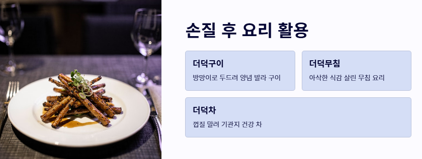 - 껍질 버리지 마기: 깨끗하게 씻어서 벗긴 더덕 껍질은 말려서 차로 끓여 마시면 기관지에 아주 좋습니다. 영양을 통째로 챙기는 완벽한 더덕 껍질 벗기는 법의 응용입니다.