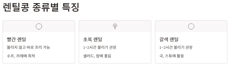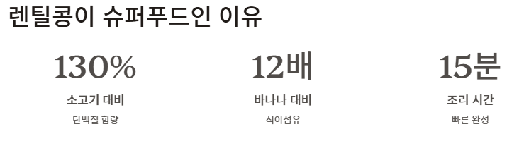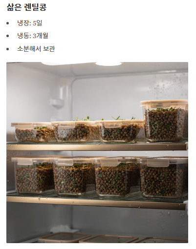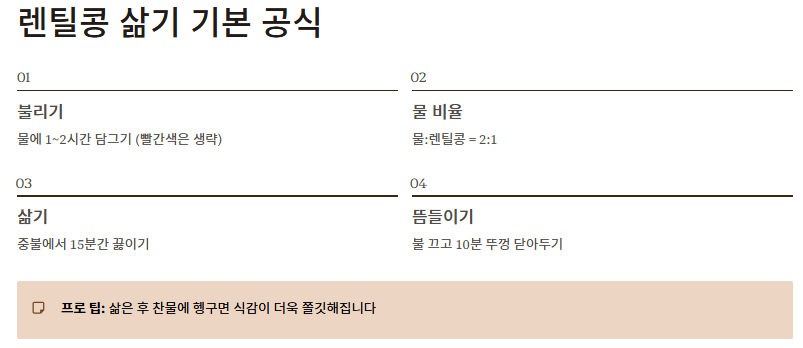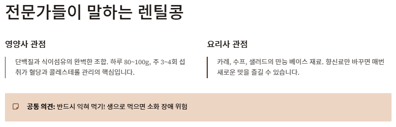 요리사 관점: 렌틸콩은 '카레, 수프, 샐러드' 베이스 재료로 무한 활용. 커민·고춧가루·허브로 향신료만 바꾸면 매번 다른 맛.