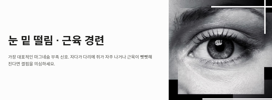 - 눈 밑 떨림, 다리 쥐, 만성 피로, 불면증은 전형적인 마그네슘 부족현상입니다.