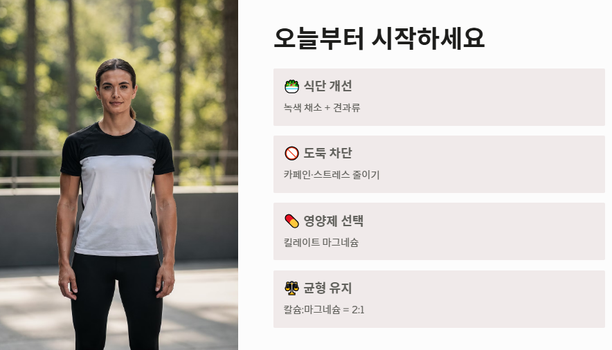 - 녹색 채소와 견과류 섭취를 늘리고, 필요시 흡수율이 좋은 영양제를 복용합니다.