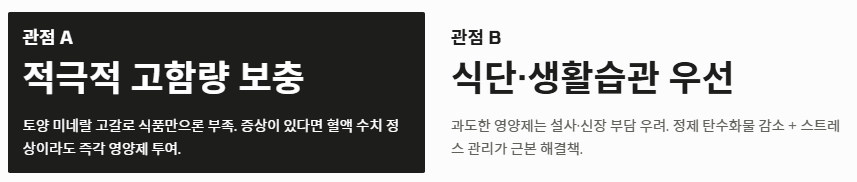 - 개인의 건강 상태에 따라 식단 관리와 보충제 투여를 적절히 병행해야 합니다.