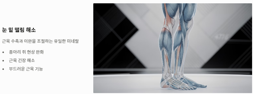많은 분이 알고 계시는 눈 밑 떨림이나 종아리 쥐 현상을 해결하는 것은 근육 수축과 이완을 조절하는 마그네슘 효능 덕분입니다. 칼슘이 근육을 수축시킨다면, 이를 부드럽게 풀어주는 것은 오직 마그네슘 효능만이 할 수 있는 역할입니다.