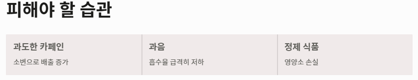- 흡수 방해 요소 차단: 과도한 카페인과 알코올은 소변으로 영양소를 배출시켜 마그네슘 효능을 떨어뜨립니다.