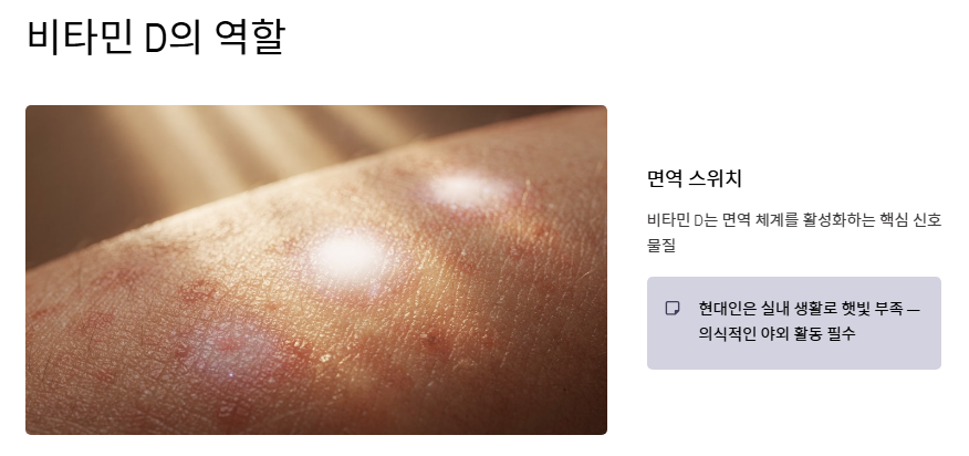 비타민 D는 면역 체계의 스위치를 켜는 역할을 합니다. 하루 20분 정도 햇볕을 쬐며 산책하는 것만으로도 자연적인 비타민 D 합성이 유도됩니다. 외부 활동이 적은 현대인에게는 햇빛을 통한 영양 보충이 필수적인 면역력을 높이는 방법이 됩니다.