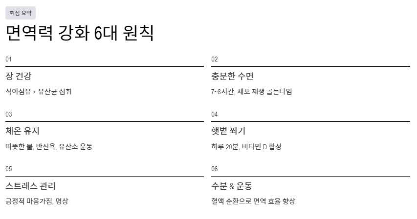 - 꾸준한 운동과 수분 섭취는 혈액 순환을 도와 면역 효율을 높입니다.