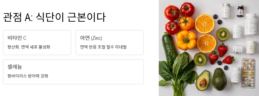 - 관점 A: "식단과 영양 보충이 근본이다" 우리가 먹는 것이 곧 우리 몸을 만든다는 관점입니다. 비타민 C, 아연, 셀레늄 등 면역 필수 미네랄이 풍부한 식품 섭취를 강조합니다. 이들은 면역력을 높이는 방법으로 제철 음식과 균형 잡힌 영양 식단을 최우선 가치로 둡니다.
