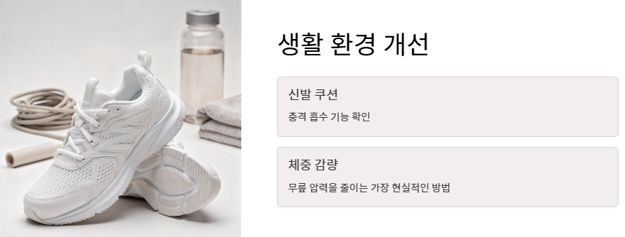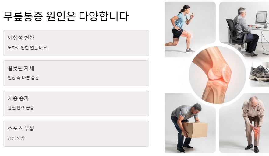 단순히 통증만 없애는 것이 아니라 무릎통증 원인을 근본적으로 차단하는 단계별 대응법입니다.