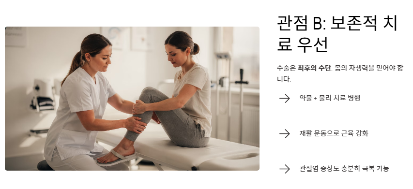 - 관점 B: '보존적 치료와 운동 요법' 우선 수술은 최후의 수단이며, 우리 몸의 자생력을 믿어야 한다는 관점입니다. 약물 치료와 물리 치료를 병행하면서 재활 운동을 통해 근육을 키우면 무릎통증 원인이 되는 관절염 증상도 충분히 극복 가능하다는 시각입니다.