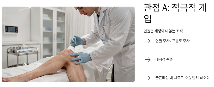 - 관점 A: '적극적인 의학적 개입' 중시 연골은 재생되지 않는 조직이므로, 통증이 심해지기 전에 주사 요법(연골 주사, 프롤로 주사)이나 내시경 수술을 통해 무릎통증 원인을 물리적으로 해결해야 한다는 입장입니다. 초기 골든타임을 놓치지 않는 것이 수술 범위를 줄이는 길이라고 봅니다.