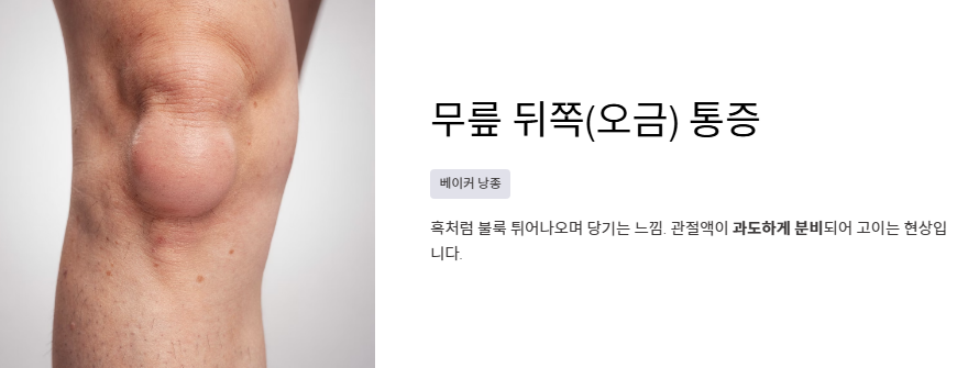 - 무릎 뒤쪽(오금)의 통증: 혹처럼 불룩 튀어나오면서 당기는 느낌이 든다면 '베이커 낭종'이 무릎통증 원인일 가능성이 큽니다. 관절액이 과도하게 분비되어 고이는 현상입니다.