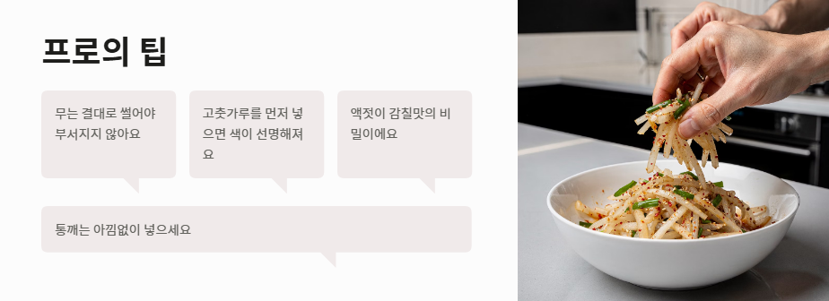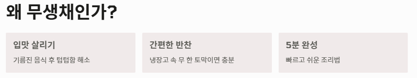 - 마무리: 신선한 재료 선택이 결국 최고의 무생채 맛있게 하는법을 결정짓습니다.