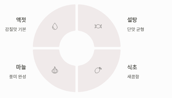 무생채 맛있게 하는법에서 가장 중요한 것은 양념의 조화입니다. 멸치액젓 2큰술, 설탕 1큰술, 식초 2큰술, 다진 마늘 1큰술을 기본으로 합니다. 이때 액젓을 사용하면 소금만 썼을 때보다 훨씬 깊은 감칠맛을 낼 수 있습니다. 이 양념 배합은 실패 없는 무생채 맛있게 하는법의 공식과도 같습니다.