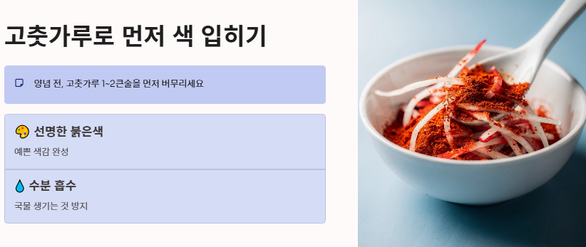 - 고춧가루로 먼저 색을 입혀 수분을 잡고 선명한 색감을 유지합니다.
