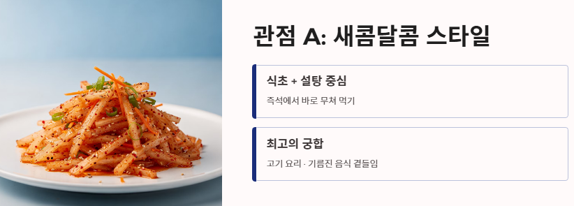 요리의 스타일과 숙성 정도에 따라 무생채 맛있게 하는법은 크게 두 가지 방향으로 나뉩니다.