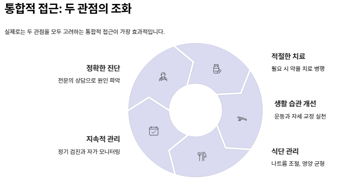 - 생활 습관 및 물리적 관점: 근육의 펌프 작용이 약해져 발생하는 현상으로 봅니다. 즉, 종아리 근육(제2의 심장)을 강화하고 스트레칭을 통해 물리적인 흐름을 터주는 것이 핵심이라는 시각입니다.