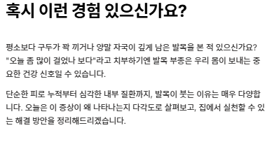 여러분의 가벼운 발걸음이 건강의 시작입니다. 오늘부터 퇴근 후 15분, 발을 심장보다 높이 올리고 휴식을 취해보는 건 어떨까요?