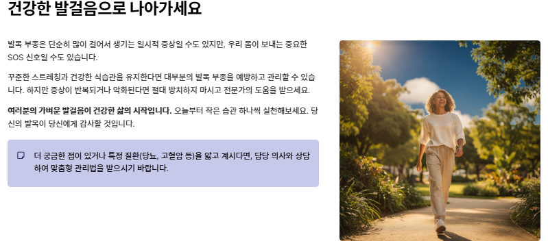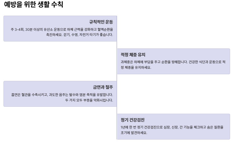 - 생활습관: 나트륨 줄이기, 발 높게 두기, 종아리 운동.