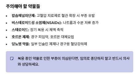 - 질환의 전조 증상: 신장(콩팥), 심장, 간 기능이 저하되면 체수분 조절이 안 되어 전신 혹은 국소 부종이 나타납니다.