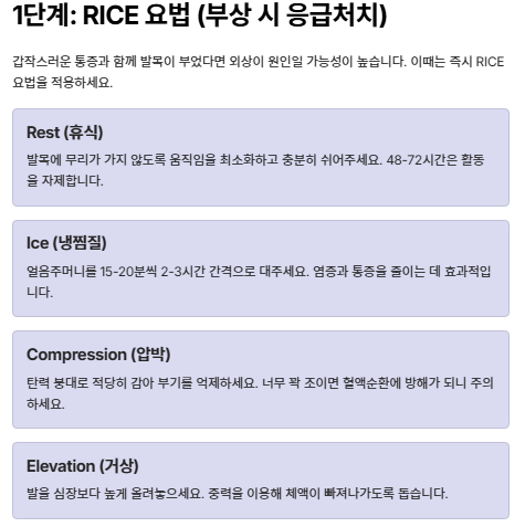 - 부상: RICE 요법으로 즉각 처치.